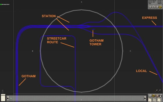 I’ve tried at least three times to build a rapid transit layout in Trainz that I could be happy with. All failed miserably. To properly model rapid transit you need lots of two- or three- or four-lane trackage, lots of stations, lots of buildings and lots of trains. At the end of the day, if you succeed in building the layout – which is time-consuming to say the least – you will probably find your system challenged by overloaded memory and degraded frame rates. If you succeed in overcoming all these challenges, you then face the question of what is really satisfying operation. I prefer the cab-view, realistic physics approach for rapid transit because it provides a lot of driving experience. When you get right down to it, BVE may actually be a better choice of sims for this genre. On the other hand, if you enjoy WATCHING lots of train activity – as though you were a train watcher – I have just the layout for you. It’s Gotham Tower. You can download the route from the VR Downloads page. Gotham Tower is for TRS2006 with SP-1. It should work with TS2009, but I haven’t tried it.