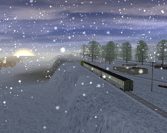 For the included session, I used a speeded up clock for the trip, which takes about a half hour of real time, but runs from 4 PM to about 1 AM simulated time. The trip starts as the sun is setting and then becomes a night run. Be sure to use the camera tracking option for some real nice snowy winter night views. The route uses Canadian National Railway equipment since that comes standard in TRS2006.