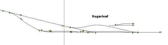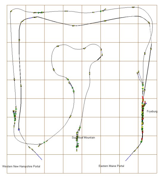 The two-track mainline from Eastern Maine to western New Hampshire uses portals to generate traffic along that route, while the single track Skier’s Limited route goes north from Fryeburg Maine, and then winds and climbs to Sugar Loaf Mountain far into the White Mountain range. The White Mountain Winter route is a fictional route designed to give a flavor of travel through the area between Maine and New Hampshire. As the tracks climb up into the mountains there are passenger stations and industries along the route for operations. Here is the TrainzMap diagram of the route: